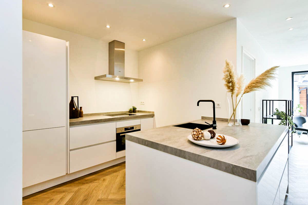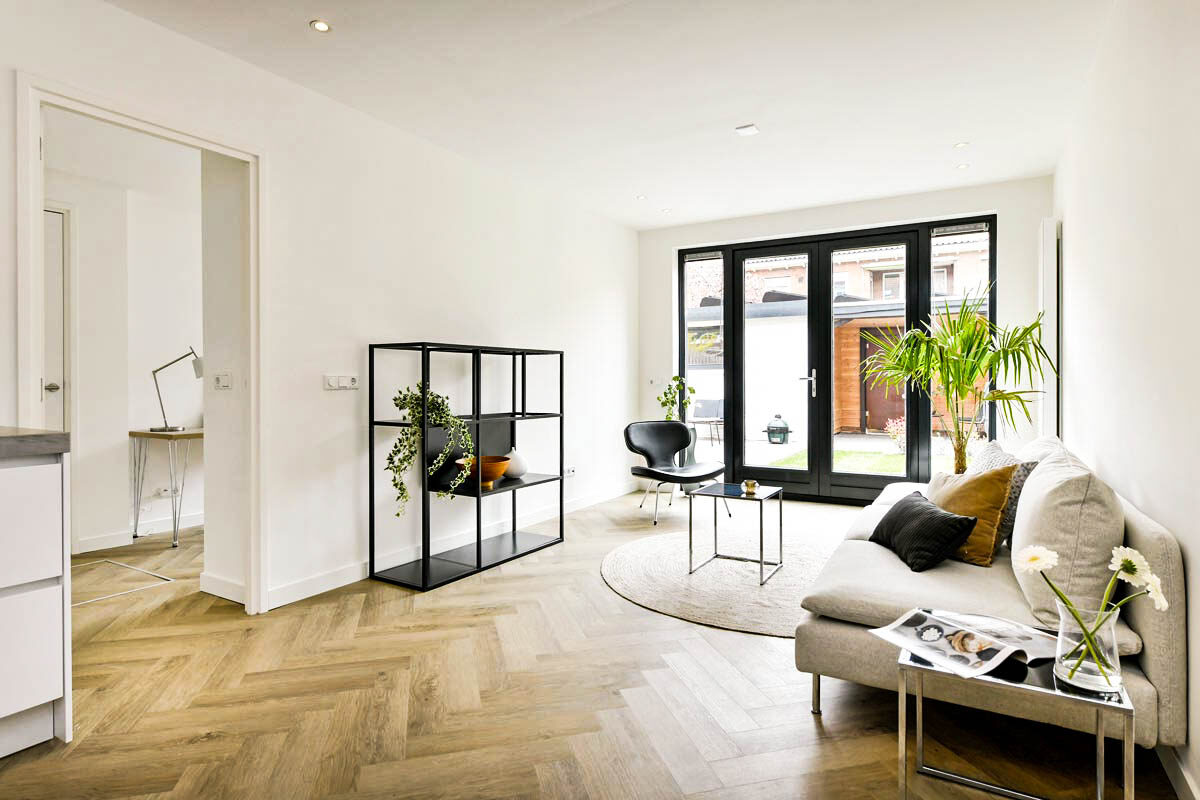 Als die oude bruine keuken eruit is, de vloer weg is en er muren gesloopt zijn, zodat we alle ruimtes optimaal kunnen benutten, kan het opknappen echt beginnen. We kiezen hierbij voor een eigentijdse en trendy inrichting. Helemaal naar deze tijd, zodat we zeker weten dat het pand straks goed in de markt ligt.